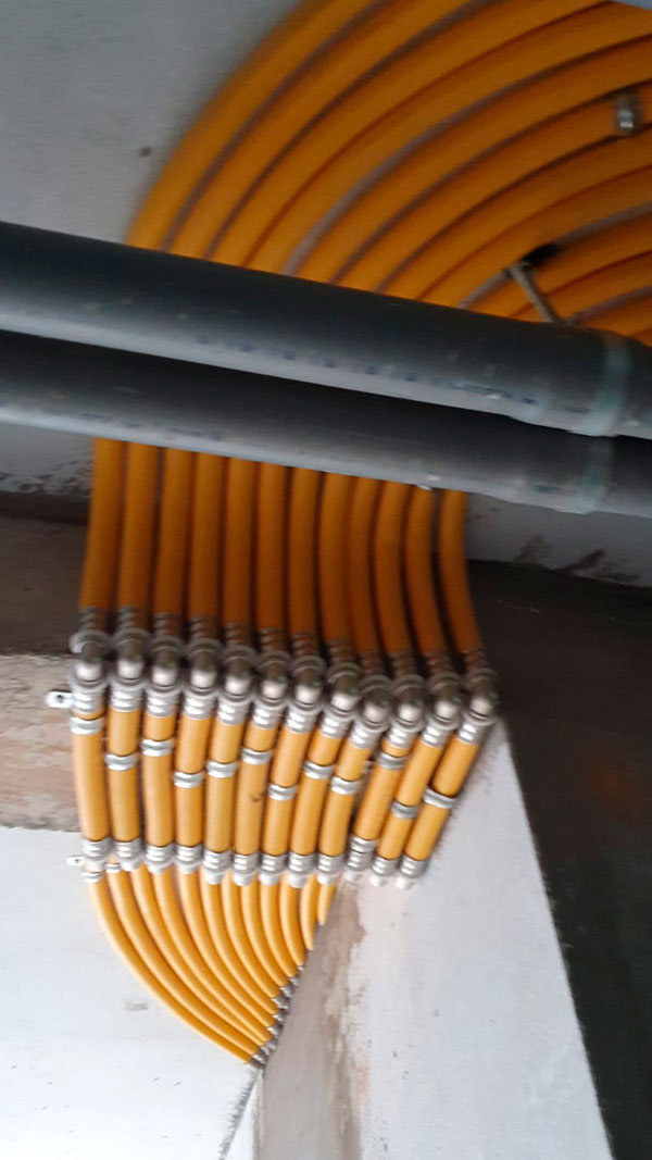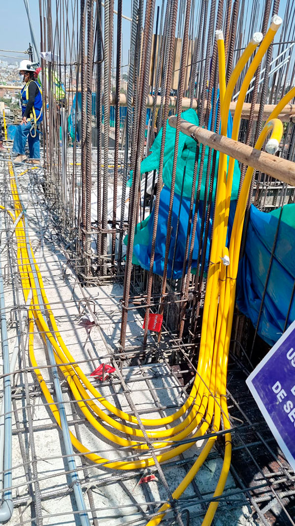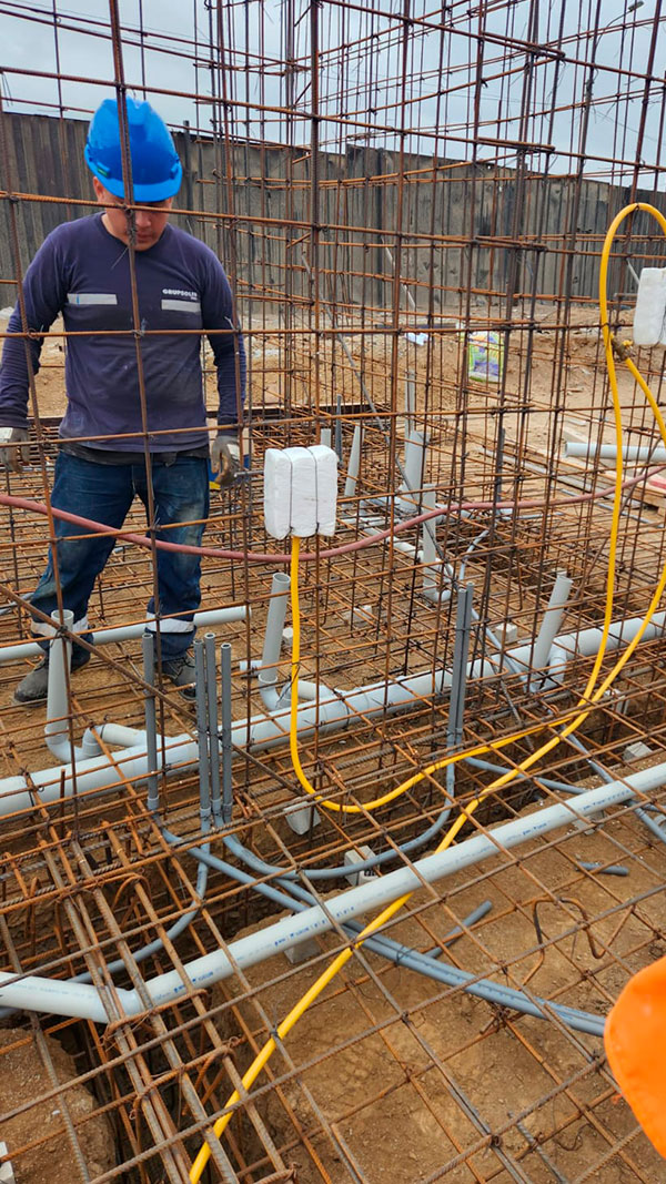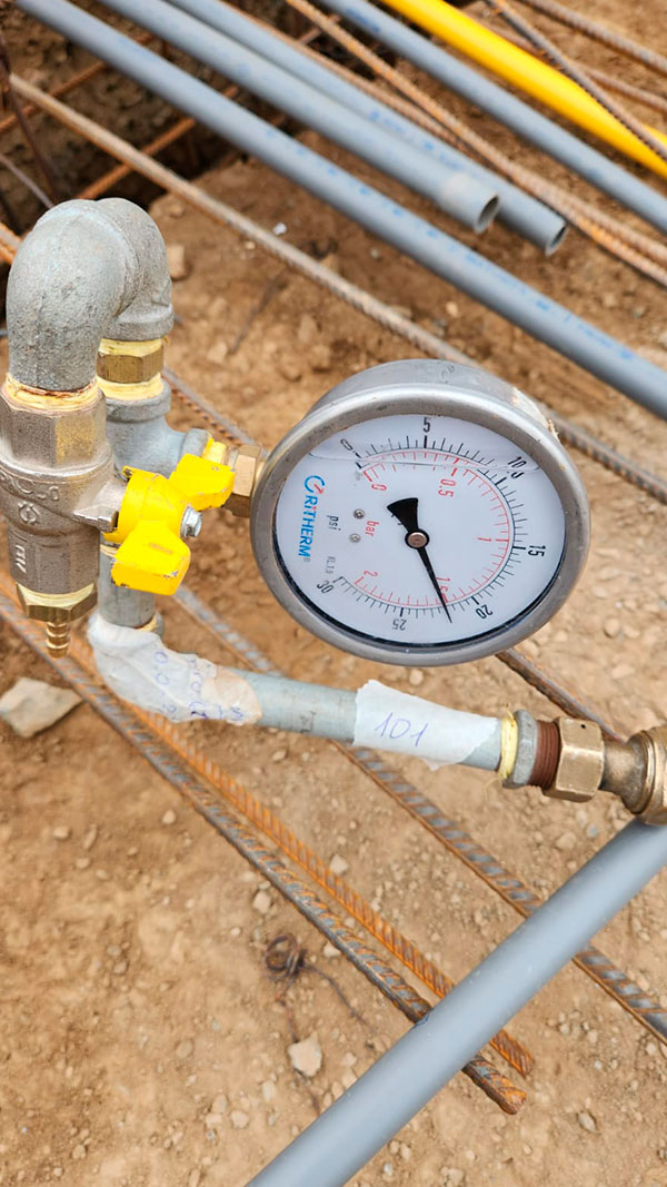 Ejecutamos el tendido de tuberías de PE-AL-PE y la soldadura de cobre según el expediente aprobado, ya sea embebido en losa durante el vaciado o en contrapiso, de acuerdo con lo que defina el cliente. Cuando el tendido va en losa, coordinamos la instalación el día previo al vaciado.